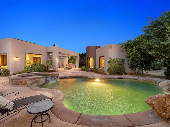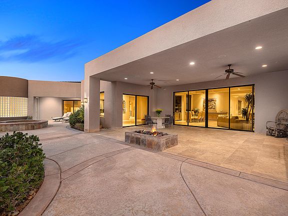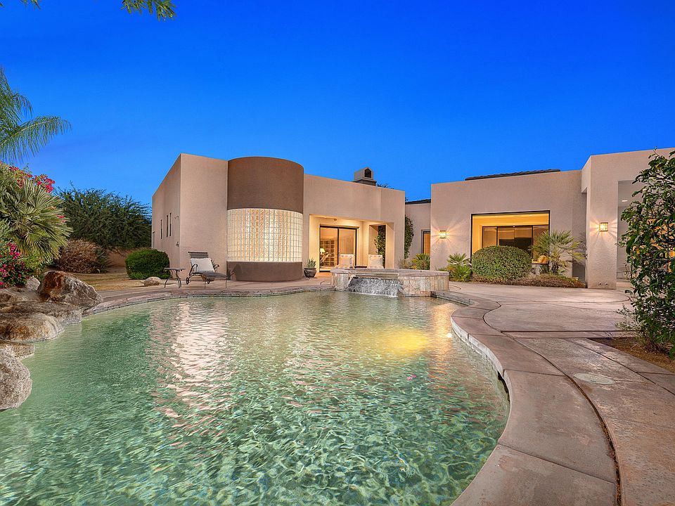 Beautiful and expansive, luxury home in The Estates of Ironwood Country Club. Southwest facing serene and resort-like waterfall, sparkling pebble-tech pool, & spa overlooking desert blooms and native trees. Interiors are adorned with a dramatic ''great room'' and a wall of pocketing glass doors that open to a covered lounge area with a fire pit, ceiling fans, and a grill. The chef's kitchen has a center island, a breakfast counter, a breakfast room, a powder room, a large pantry, and a well planned & laid out office and full laundry room. Soothing earth-toned and desert-inspired features include travertine flooring, decadent granite countertops throughout, wood cabinetry, shaded glass windows, elegant oversized rooms and soaring ceilings. Main master suite with a fireplace, wall of built-in shelving, a spa tub, large walk-in dressing room, and dual bathroom accommodations. The junior suite, also well-appointed has a steam shower, spa tub, and a walk-in closet. Uniquely designed grounds feature two independent & completely private casita suites. A three-car garage abounding with storage cabinets is attached. Several grassy areas and citrus trees offer lush outdoor spaces. Excellent value with a touch of luxury at every turn. A Palm Desert Oasis!