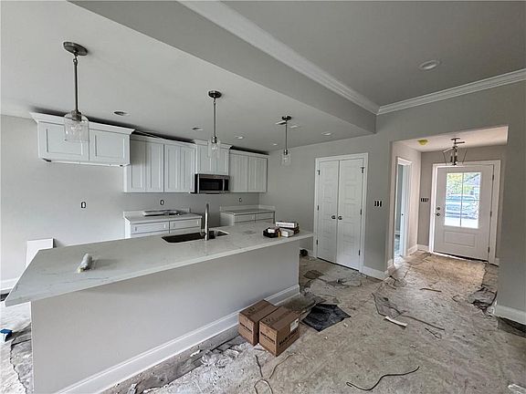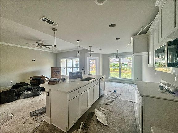 Offers a stunning floor plan w/upgraded features- Beautiful colors throughout. The kitchen is a highlight, featuring a GE appliance package, quartz countertops, and an oversized single-serving style island. Energy efficient, offering low utility bills and NO water or Sewer bill. Interior is filled with lots of natural light, crown molding, cased-in windows, and maintenance-free flooring! Spacious owners suite with large walk-in closet and dual sinks.
