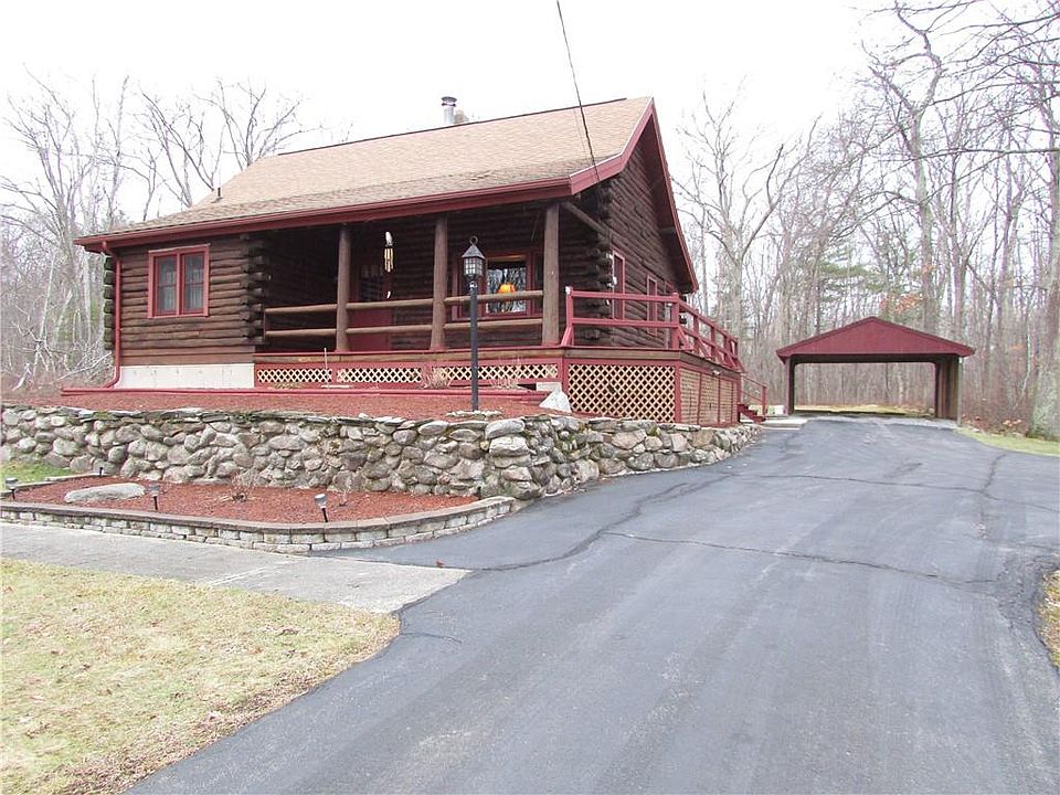 Beautiful Country Log Home. Meticulously maintained. Master bedroom on 1st floor. Open floor design wraps around an elegant stone hearth with cathedral ceiling and hardwood plank floors. . Center island kitchen with adjacent dining area. Wrap around farmers porch. Large full bathroom on 1st floor. 2 car carport and exterior shed. Pellet stove in the basement along with a cedar closet. 3.8 acre lot in a quiet location. Contingent upon Seller finding suitable housing.