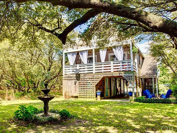 This charming renovated cottage is centrally located in the heart of Kill Devil Hills, just a short distance to the public beach access. Enjoy 3 bedrooms and 2 full baths upstairs, and a separate ground-level unit with 1 Bed, a full bathroom, and kitchenette. The private yard shaded by gorgeous live oak trees is perfect for relaxing and playing yard games. Outdoor boasts pea stone patio, private outdoor shower, main deck with dining table for 8, an extremely private upper deck, and 5 seat hot tub. The main home as an airy open living/kitchen combo with vaulted ceiling, shiplap walls, granite counters, and beaming hardwood floors. Also on this floor are two bedrooms with sliding glass doors leading to the private back deck. The main bath on this floor is nicely updated with tile floors and subway tile shower.  The hardwood stairs lead to the 3rd floor and primary bedroom. The space has vaulted ceilings, shiplap walls, and a beautiful custom walk in shower that you will love! Private 3rd floor deck ideal for sun bathing. Updates include: New hot tub (2021), new roof (2020), downstairs remodel with split unit (2019), outdoor shower (2019), hardie plank siding (2015), vinyl windows (2015), slider (2015), drainfield (2016), and hot water heater (2021).
