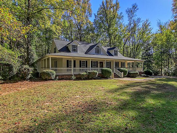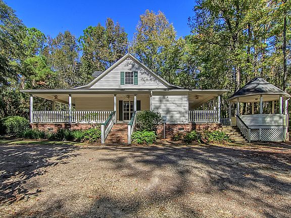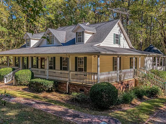 Incredible ownership opportunity! Situated at the end of a private road on 3.69 acres, this property features 4 bedrooms and 2 full baths in the main house, a 2-car garage/workshop with a 1 bedroom/1 bath Guest House above, and another 3-car garage. With no HOA, it's the perfect place to live and work as there is plenty of space to have a full workshop and keep equipment or vehicles. The main house has lots of southern charm, with a full wraparound front porch, back deck with gazebo and brick walkway. Inside you'll find an impressive vaulted ceiling with wood beams and brick gas fireplace in the main living area. The island kitchen has plenty of cabinet and counter space and includes a gas cooktop with hood. Two bedrooms, one with an ensuite bath, are situated on the firstfloor and two additional bedrooms are found upstairs. The Guest House/Mother-in-Law offers a full kitchen, living room, bedroom and full bath and sits above an oversized two-car garage that has both plumbing and electric and would be the perfect area for a workshop. A separate 40' x 30' three-car garage can store several vehicles or serve as another workspace. The property offers a picturesque wooded setting and sits on its own creek with a fishing pier and adjacent seating area. The possibilities are endless to live, work or rent multiple spaces!