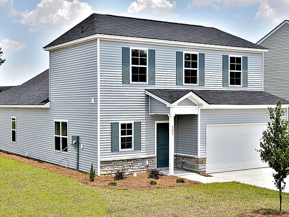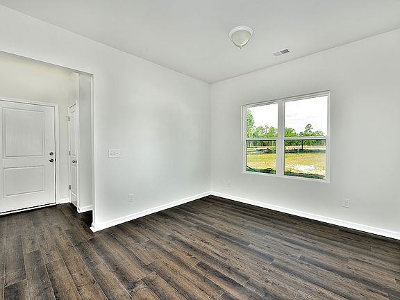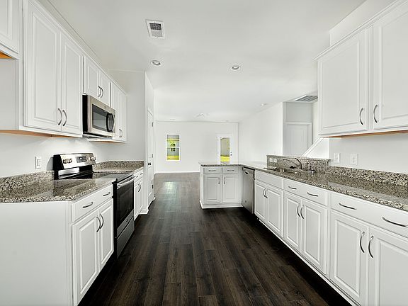 Welcome home to this three bedroom, two-and-one-half bathroom home with 1,844 square feet of living space! This home has plenty of curb appeal with a stone water table, a fully sodded yard, and irrigation! You will be greeted by dark luxury vinyl plank flooring that continues throughout the main living areas on the first floor! The spacious eat-in area offers plenty of entertaining space! The kitchen includes upgraded raised panel white cabinets with crown molding and hardware, granite counter tops, and GE stainless steel appliances. The master suite is on the main floor and features a vaulted ceiling. The master bathroom includes raised vanities with white cabinets and granite counter tops, a separate tub and shower, and a walk-in closet! The secondary bedrooms upstairs both feature walk-in closets and share a bathroom with two sinks!