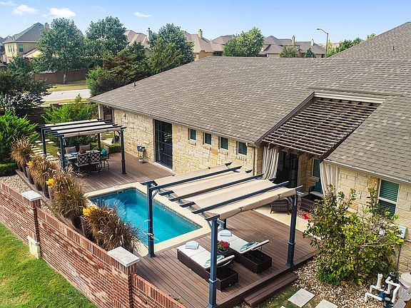 TERAVISTA Master planned Community. A 1-story Wes Peoples free-flowing designer home with no homes in back and located on an oversized corner lot with a small pool perfect for lounging. Don't miss out on the impressive upgrades: professional grade appliances, lighting, porte french metal doors and porte front door, trex deck, 2 pergolas, a covered patio and a shaded patio, custom window treatments, custom masonry flower beds, and hardwood floors throughout main areas. Garage has been finished out and air-conditioned for workout space and additional living area...but it is still a garage!