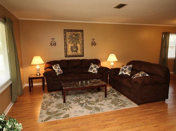 Enjoy your front porch on this fantastic move in ready home very near Lawson Road entrance. This home has 2 living areas. Woodburning fireplace in den. Nice built-in shelving in living room that opens up to dining area. Stainless steel appliances in the kitchen with lots of cabinets. Both bathrooms were recently updated. Side entry car port with extra storage. Level lot with big backyard that is completely fenced with storage shed. Lake Forest is a golf course community that also offers 3 outdoor pools, playgrounds tennis courts, clubhouse and much more.