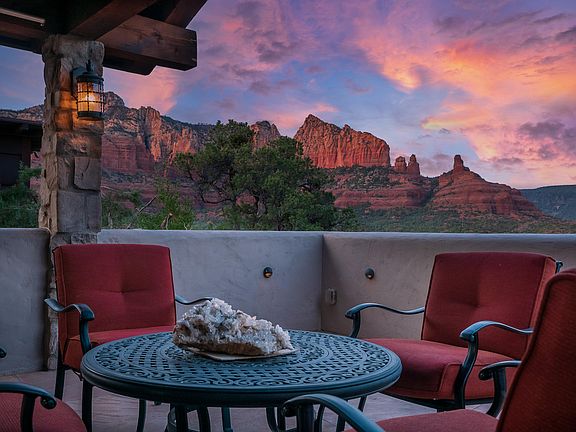 Immersed in luxurious Old-World architecture, magnificent 360 degree Sedona red rock views, gorgeous water features, and you don't have to travel overseas to feel like you've stepped onto the streets of Italy inside this modern Italian-style Villa. Many famous celebrities like Gina Davis, and authors like John Grey (Men are from Mars, Women are from Venus) have been inspired by the beauty, location, energy healing, and Zen-like state this elegant retreat offers. Read the Home History Book found in the MLS listing. Walls graced with natural Venetian plaster, an organic material harvested from nature. Herringbone brick flooring seen throughout castles and homes of the elite. Gorgeous sunrise & sunset viewing decks showcase the magnificent red rock beauty Sedona offers.