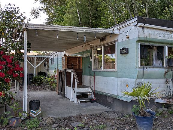 Very cute 1957 Mayflower trailer in a very nice setting with a carport, covered porch, and yard. Very efficient use of space with generous storage space. Standard size new range and standard size refrigerator. Needs someone who will give it tender loving care. Room to resurrect the gardens that the previous tenants destroyed. Water, sewer, garbage included. No smoking.