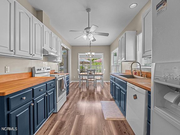 The kitchen has charming navy cabinetry with butcher block countertops, a breakfast nook, a spacious pantry for storage and refrigerator.