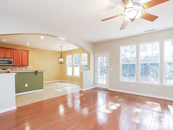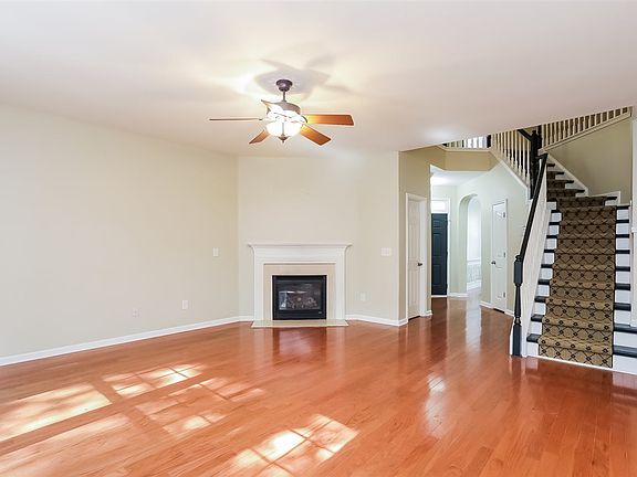 This Cary three-story offers hardwood flooring, a fireplace, an office, and a two-car garage.