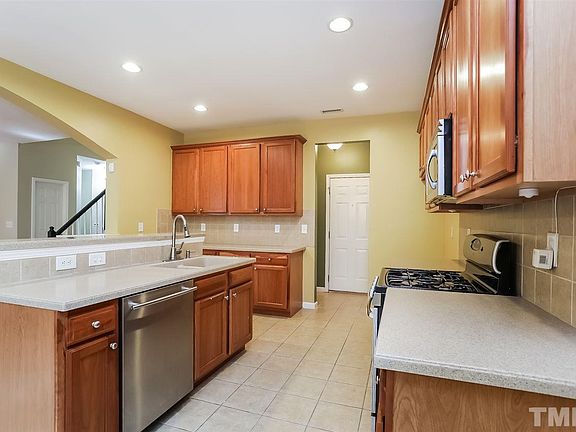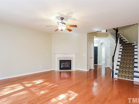 This Cary three-story offers hardwood flooring, a fireplace, an office, and a two-car garage.
