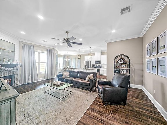 The Open-Concept Layout Seamlessly Connects the Kitchen, Dining and Living Areas, Creating an Ideal Space for Everyday Living and all those Family Gatherings. A Cozy Fireplace Brings Warmth and Charm to the Spacious Living Room.