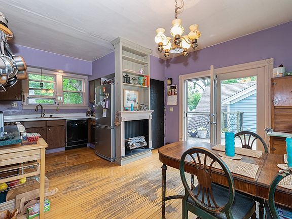 Wood galore, birch, oak, maple, bamboo and pine floors add to the character of this 1889 plaque home. Enjoy the enclosed porch with 3 heating sources. Library with built in shelves. Kitchen has table space along with patio doors going to 2nd story of garage from wooden deck that wraps around a mature tree. Upstairs bathroom features a claw tub with shower. Built in make up desk. Basement has a finished room that leads to concrete patio on main level.