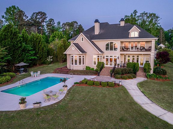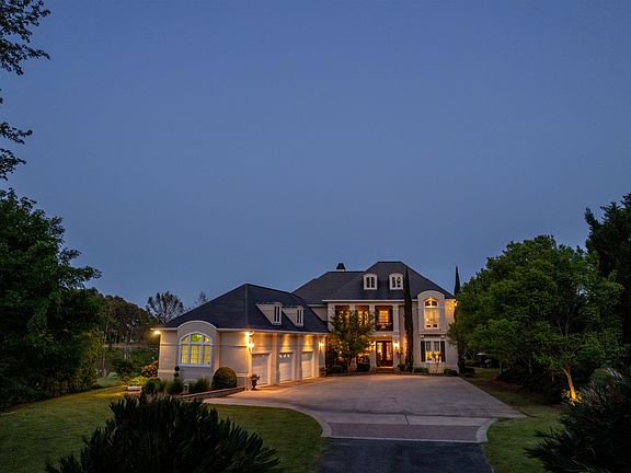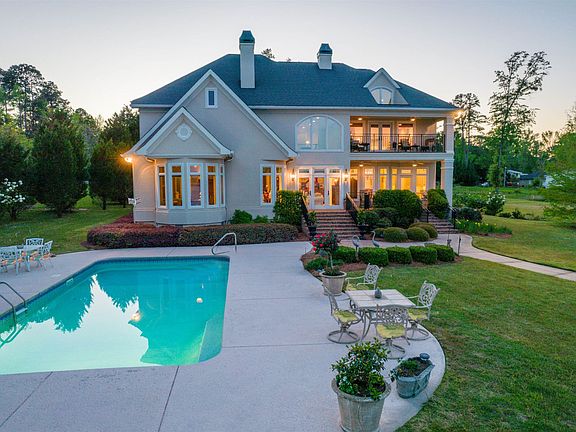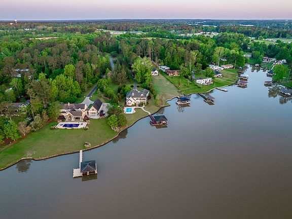 Spectacular one of a kind, waterfront home. Private, yet convenient. Enter the tree lined drive & lush landscaping, you pass a potential in-law suite or workshop and RV storage. The moment you round the bend this extraordinary 2 story home offers a luxurious feel with oversized columned porches, multiple balconies each with French doors, and double mahogany glass front doors. Covered entry extends to a foyer and romantic, spiraling staircase leading to rotunda with 22' ceilings, spacious living room with fireplace and walls of windows showcasing salt water pool, Trex walkway to the dock, and panoramic 2 mile lake view of exquisite sunrises and sunsets. Interior features include expansive 1st floor owners suite with stunning ceilings. Master bath is to die for! Spa bath, Roman tile shower with multiple shower heads, Amazon Rain Forest & heat lamps. Formal dining, parlor with fireplace, library, 2 half baths, and laundry. Open floor plan and gourmet kitchen with a plethora of custom cabinets allow easy access and traffic flow to porch, pool, outdoor kitchen, lake, & dock making this home perfect for entertaining. Second level features 3 out of 4 bedrooms, 2 full baths, game room, plus a flex room for today's modern family. Step outside on the balconies for incredible views or open the French doors to enjoy fresh air, sounds of birds, or wakes rushing across the water. This must see home exemplifies the highest standards of quality and excellence.