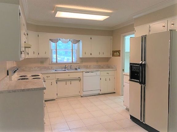 3 BR, 2 bath brick home; Primary BR w full bath, Tile and wood floors, kitchen appliances, Large lot with mature trees, lots of landscaping, fenced yard w covered patio, 2 car garage, concrete drive, storage bldg. No Pets
