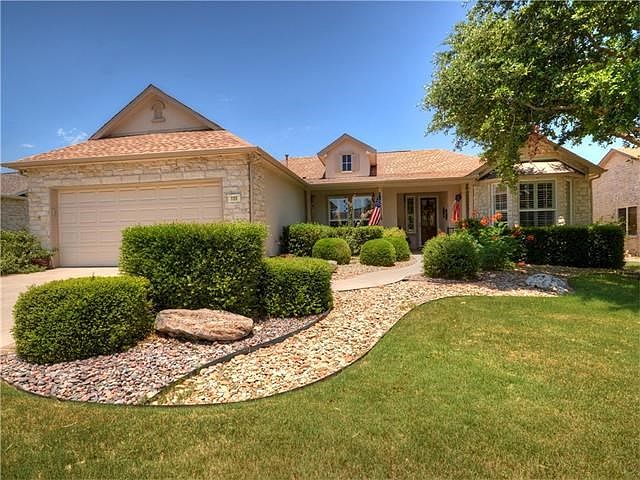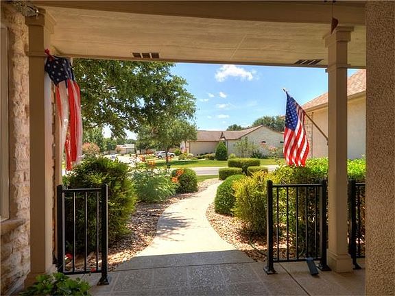 Wonderful and popular Williamson floorplan in a great location with Easy access to DelWebb Blvd. Easy to maintain Corian counter tops in the kitchen; light honey color wood cabinets; built-in Microwave and oven. Spacious study. Great room has beautiful built-ins and fireplace. An added bonus to this home is the hobby room located off the laundry room. Patio is tastefully enclosed and perfect for watching the Texas Sun set. 2 car extended garage includes side entry golf cart garage.