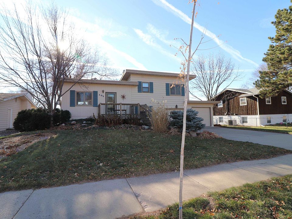 Not often that a mid-century, multi-level comes along in this well kept central neighborhood. Three bedrooms, all on the same level with original wood floors. Very large, sunny living room with wonderful south exposure, newer vinyl plank flooring and a door to a composite deck and a lovely fenced yard. Cute adjoining room that could be formal dining or a den, with some attractive wood finishes. Really cute kitchen with tiled backsplash, updated cabinets, stainless appliances, sunny dining area and a door to a large patio. There is a spacious family room in the basement with an adjoining 3/4 bath. Another full bath on the top floor. Great curb appeal with composite front deck. Extra deep double garage. FA, backsplash, vinyl plank, and garage doors - all new since 2020.