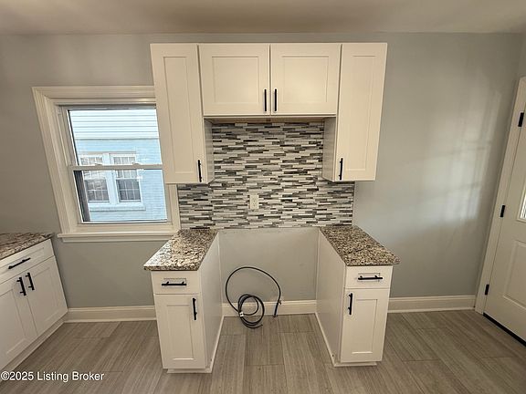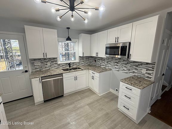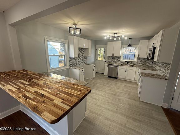 Fully renovated 4-bedroom, 2-bathroom home with a beautifully finished basement. The open-concept living room boasts a stunning stone fireplace and refinished hardwood floors, seamlessly connecting to the modern kitchen. This kitchen features new cabinetry, granite countertops, a butcher block bar area, a tiled backsplash, and includes all stainless steel appliances: stove, dishwasher, and microwave.