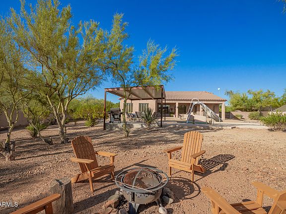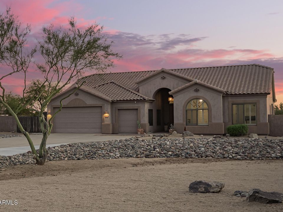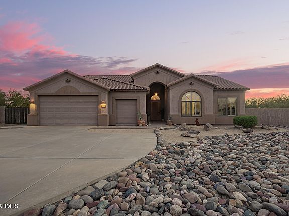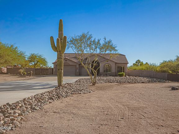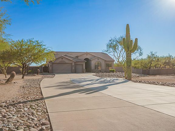 Serene desert surroundings. Resort-style outdoor living. Total privacy. This exceptional home truly has it all. Set on more than an acre, this 2,668 sf retreat features 3 bedrooms plus a den, 2 bathrooms, an RV gate and parking, an extended driveway with river rock accents, and a 3-car garage with one bay thoughtfully converted into a bonus room/office. Mature Arizona desert plants and trees set a calm, welcoming tone from the moment you arrive. Major improvements bring added peace of mind, including a brand-new roof in 2025, a completely new HVAC system installed in 2023, and whole-house water purification. Inside, abundant natural light pours into a bright, neutral interior with plantation shutters, tall ceilings, upgraded ceiling fans, and a seamless blend of tile and carpet . . . flooring. Entertain effortlessly in the formal living and dining room or settle into the cozy family room equipped with surround sound for those movie nights. The impressive kitchen shines with stainless steel appliances, granite countertops, recessed lighting, white shaker cabinetry, a pantry, and a central island with a breakfast bar. A versatile den with a Murphy bed provides flexibility for guests or work-from-home needs. Double doors introduce the spacious primary suite, where you'll find a spa-like ensuite with dual sinks, a separate shower and soaking tub, a walk-in closet, and a private exit to the back patio for peaceful mornings and starry desert nights. The laundry room offers additional convenience with a sink and plenty of cabinetry. Step outside to your own private paradise. The south-facing backyard is designed for year-round enjoyment, featuring a sparkling pool with a slide, a covered patio, and a shaded Ramada. There's even a custom steel and concrete fully enclosed area that's perfect for pets. Best of all, every evening ends with breathtaking sunsets melting into the skies. Zoned R-43, this property provides room to expand and the opportunity for equestrian use and other large-lot amenities. A rare blend of tranquility, comfort, and incredible Arizona outdoor living. This property also offers 50-amp service for the RV in your life! Come see why this home is the dream you've been waiting for!