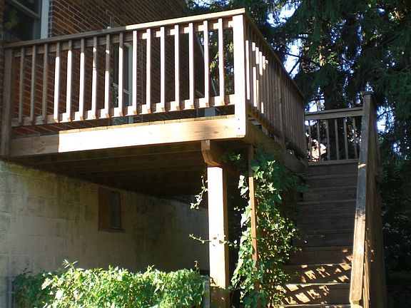 Exterior Features:Brick house with yard surrounded by shrubbery, with back yard and deck. Interior Features:Interior in overall fair condition also. Kitchen is in decent shape but dated. Fridge and stove present. Laundry hook-ups in the basement. Bedroom on first floor has hardwood floors and drywall in fair to good condition. Upstairs has carpeting in poor to fair condition. Complete bathroom on first floor is in poor condition. Full, unfinished basement with newer breaker panel but older furnace and hot-water tank. Water softener present.