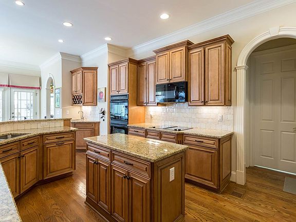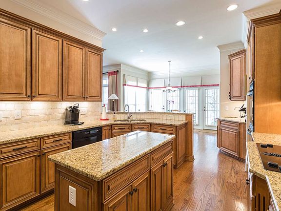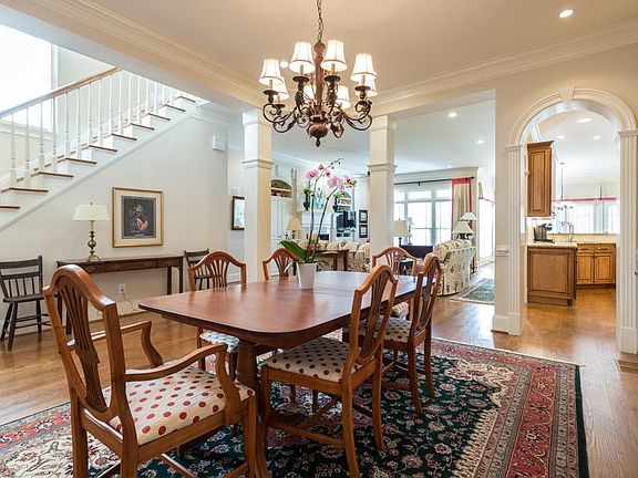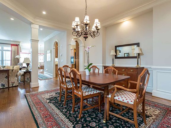 Beautifully appointed home ~ elaborate millwork, upgraded cabinetry/built-ins, main level master suite with his/hers dressing areas, main level study, gracious dining room, kitchen to delight the chef! Spacious FR w/gas log FP & built-in cabinetry. Second level BR's with baths en suite, bonus room with walk-in closet can serve as 4th bedroom. Unf walk-up attic & huge unf daylight basement = loads of opportunity to expand! Woods & golf course to rear. Walk to pool, village center, elementary, CHCC & more!
