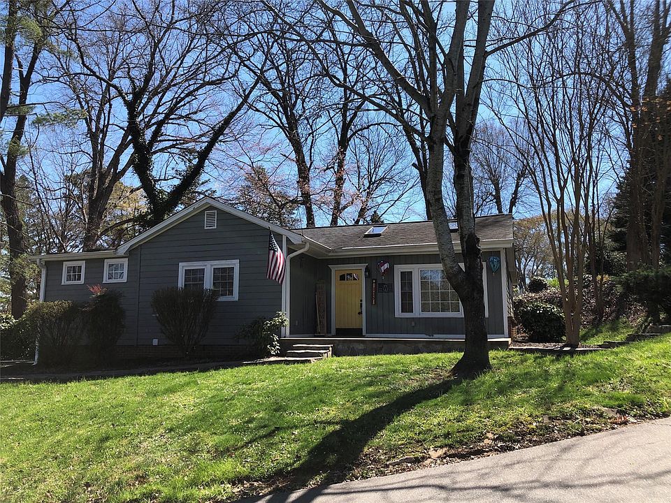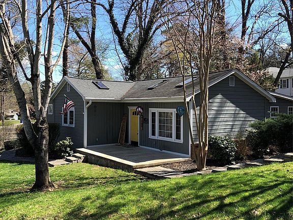 Super cute bungalow on corner lot inside Rutherfordton town limits! Public utilities, access to high speed internet & charming curb appeal. Unique open layout w/original wood floors, step-down sunroom w/french doors, and skylights for tons of natural light. Tongue & groove ceilings, hall bath w/tile shower and a spacious laundry/office that leads to one bedroom. Primary bath offers a huge claw foot tub. Adorable back yard patio w/landscaping that feels like an English garden.
