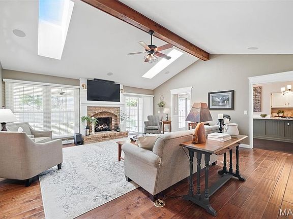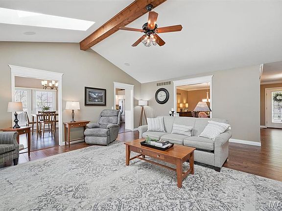 This gorgeous ranch on a quiet cul-de-sac has a BRAND NEW 40-yr roof (2024), fenced level yard & outstanding finished lower level! Soaring vaulted ceilings & NEW (2024) skylights make the main level feel open & inviting. Rich hardwood floors flow throughout the heart of the home, including the stunning kitchen featuring granite counters, breakfast bar island, hammered copper sink & 5-burner gas cooktop. Share meals in the sunny breakfast room, beautiful formal dining room or outside on the covered patio. Entertain in one of the best lower level rec rooms you will ever see! Includes a wet bar w/granite counters, soft-close cabinets w/roll-out trays, dishwasher & wall ovens. Media room projector, screen & A/V equipment included in the sale, making for spectacular viewing. Home office w/built-in workstation. Full bath w/heated floors. Jump on 364 to get anywhere in minutes or the Katy Trail for hikes/biking. Francis Howell Schools, including BRAND NEW North High. Great home! See it today!