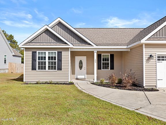 Are you looking for a family home in a quiet neighborhood, located less than 10 minutes from the beach? Welcome home to 105 Grander Court! This home is nestled in the established neighborhood of Grantwood Subdivision and is walking distance to Dixon Elementary, just 10 minutes from Topsail Island, 10 minutes to the back gate of Camp Lejeune and 5 minutes to Stone Bay. This coastal bungalow includes 3 bedrooms, an office & two full bathrooms. Walking into the home, you are greeted by new flooring, vaulted ceilings, and a gorgeous eat-in kitchen. The master suite is located on a quiet corner of the home and boasts a walk-in shower, large bathtub, and dual vanities. The other two bedrooms and a full bathroom are located off of the living area. This home also boasts an office with french doors. Moving out the back door, you will find a huge backyard (located on almost an acre!) with a smaller fenced in area (with a brand new fence!) Located on a quiet side street/culdesac and backing up to miles of woods, this is the place to be if your looking for peace and quiet.