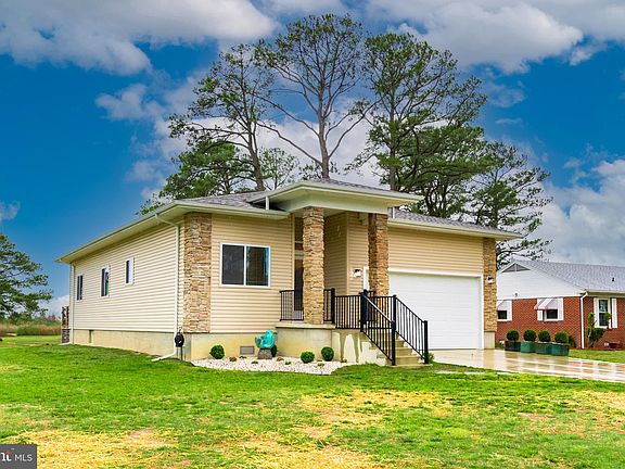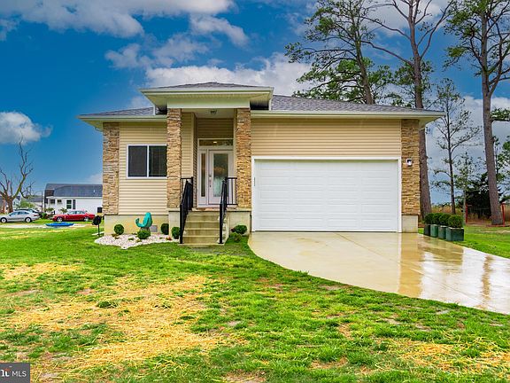 Wow! This contemporary home has many features in an efficient space. Large spacious kitchen with granite countertops, stainless appliances, hardwood flooring, upgraded soft close cabinets, dining area and living room that opens to a unique deck for watching the evening sunsets. The owner has added so many unique artistic touches to this well built home. Three bedrooms, primary bedroom has private bath and walk in closet with organized shelving. Walk in tiled shower and jetted tub, two vanities in primary bathroom. Hall bathroom has tiled tub/shower combo, porcelain tiled floors. Large utility room has washer and dryer and oversized stainless sink, leads to a two car garage. Concrete driveway, and so many unique exterior imaginative artistic displays to charm you! First class materials and construction throughout this home. Just a short walk to the public beach and fishing/kayak pier at Brick Kiln, and convenient to the hospital. Just a short drive to the ocean beaches at Assateague and Ocean City.