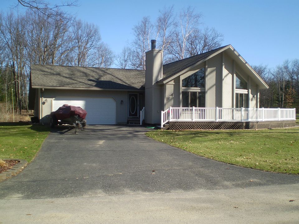 Beautiful canal front 1.5 story Chalet in high demand location of fine newer homes. Short peaceful boat ride to Houghton Lake. Nicely landscaped with terraced walls and stone steps to Trex decking at waters edge. Easy maintenance. Open living in great room with lots of windows and vaulted ceiling and gas fireplace. Central air. Third bedroom is loft. Master suite has sitting area facing waterfront deck. Sprinkler system. 12x14 attached shed to garage. Move in ready. Newly updated items are: New water heater 2013; new 95% efficient furnace 2014; new roof 2016; new house paint 2016; lawn irrigation heads completely either replaced or rebuilt; garage insulated and drywalled; central A/C; both bathrooms redone with new flooring, cabinets, fixtures, vanities, lavatories; new carpeting 2017; garage door opener; new insulated garage door 2014. Furniture is negotiable. Call owner, 231-357-0252, for more information or showing.