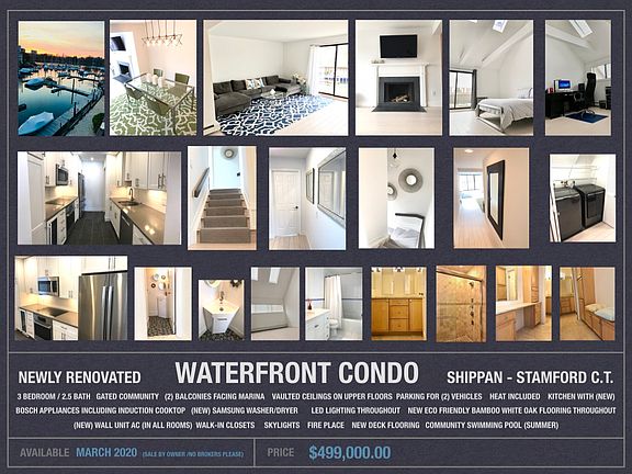 OFFER ACCEPTED... For Sale by Owner - No Brokers! Visit the Condo webpage www.136HarborDrive.com Waterfront Condo in a great but quiet location. 500 yards from Vineyard Vines HQ, 1.5 miles from Reuters HQ and Stamford Metro-North/Amtrak We currently have a renter until May of 2020 but is willing to move-out earlier if required. Showings are only Saturday mornings (to be confirmed with renter) with pre-qualified mortgage papers in hand. 3 BEDROOM / 2.5 BATH / Furnished HEAT INCLUDED IN H.O.A ! GATED COMMUNITY VERY QUIET AREA / GREAT DAYLIGHT THROUGHOUT THE DAY / (2) BALCONIES FACING MARINA / BEACH RIGHTS AVAILABLE / PARKING FOR (2) VEHICLES / KITCHEN WITH (NEW) PREMIUM BOSCH APPLIANCES INCLUDING INDUCTION COOKTOP (NEW) SAMSUNG WASHER/DRYER / LED LIGHTING THROUGHOUT / NEW ECO-FRIENDLY BAMBOO WHITE OAK FLOORING THROUGHOUT / VAULTED CEILINGS & SKYLIGHTS ON UPPER FLOORS / (NEW) WALL UNIT AC IN ALL ROOMS / WALK-IN CLOSETS / FIREPLACE / NEW DECK FLOORING / COMMUNITY SWIMMING POOL (SUMMER) / PETS ALLOWED