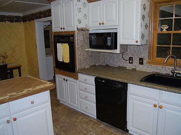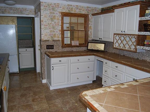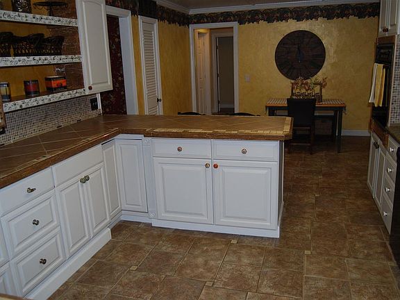 - Kitchen: Counter Tops-Formica, Eat In, Counter Tops-Tile, Floors-Tile, Backsplash-Tiled, Cabinets-Glazed