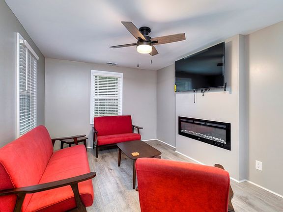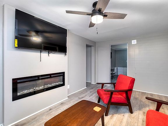 Newly renovated 3 bed, 1 bath home. Interior features living room, eat in kitchen with granite countertops, tile backsplash, new appliances & cabinetry, spacious owner suite with walk in 10 x 17 closet & desk. All new LVP flooring, Levelor blinds, windows, HVAC system, Metal roof, keyed mailbox, 2 x 50 electric fireplaces, and ceiling fans. Range and water heater (propane gas). Renovated bath features tile shower/tub combo, and double vanities. Exterior features include spacious yard with storage shed, and carport. Fully furnished option available for additional costs.