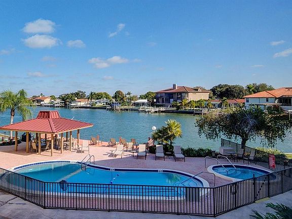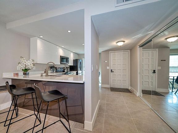 One or more photo(s) has been virtually staged. Sophisticated elegance best describes this beautifully updated condo. This is a 2 bedroom with 2 full bath home that has high end finishes throughout. The kitchen has been opened to the main living area making it an open concept living space. The kitchen is finished with high end custom cabinets, stainless steel appliances and quarts countertops. The master retreat has a window with pool and water views. The master bath has custom walk-in shower with decorative glass tiles, custom cabinetry and his and hers separate sinks with quarts counter tops. The guest bath is a mirror image the designer finishes of the master bath. This home is also finished with custom lighting and 18x18 tile through the entire home. Windows and doors are also updated. Located at the Islander this is a 55 plus community. The amenities include, underbuilding parking, storage closet, heated pool and spa. This is a short stroll to Publix grocery, fine dining, gas station, and bank. All this is 25 minutes to 2 International airports and half a mile to our world-famous Clearwater beach.