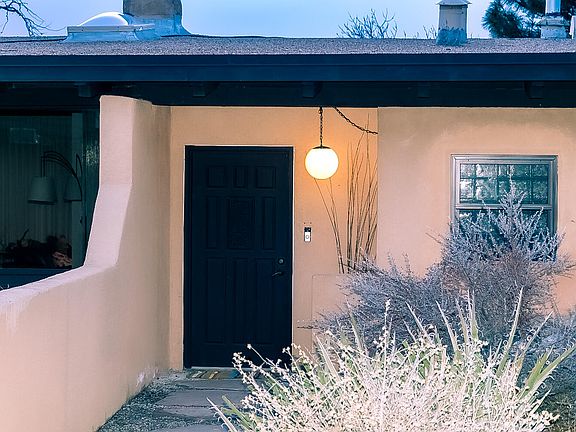 An exciting fusion of Southwest & Mid-Century Modern styles; 1-level design tucked into the desert foothills of Sandia Heights. Created to take advantage of indoor/outdoor interplay while still maintaining privacy. Thoughtful re-imagination & renovation results in a realignment of interior open spaces. Sweeping views from floor-to-ceiling windows to the mountains, the City & beyond. Flynn & Smith Design revitalized the kitchen & baths to sleek & contemporary effect. Brick floors added to bedroom wing provide continuity with the rest of home. Mechanical updates incl kitchen appliances, refrig air, water softening system & 2 water heaters. Aesthetic updates incl plantation shutters inside & asphalt driveway outside. Two Kiva FPs for warm ambience; multiple patio spaces for outdoor living.