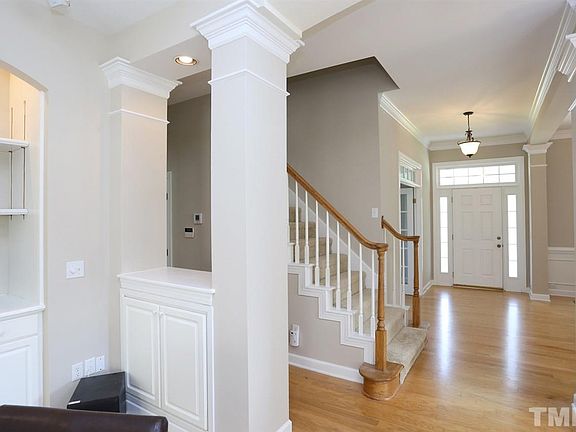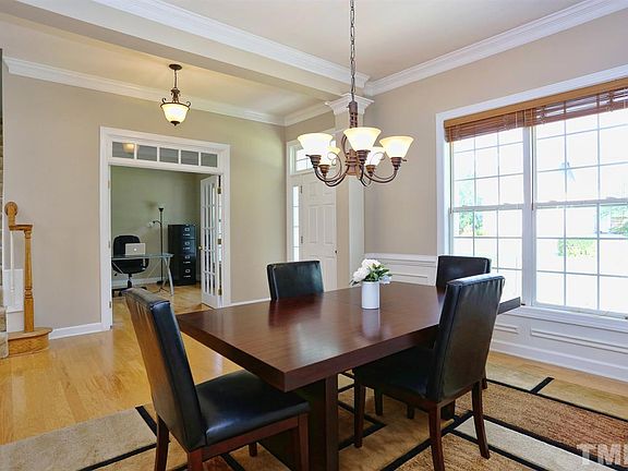 A wonderful opportunity awaits you in western Cary. A 1st floor master suite w/sitting area, huge master bath, formal living room (currently used as an office), spacious dining room w/crown molding and wainscoting, kitchen w/granite countertops & stainless appliances, large family room w/ bay windows, shutters, gas fireplace, & built in shelves, huge bonus room w/wet bar, rocking chair porch & large deck all grace this lovely home. 2-10 Home Warranty included. Move in ready!