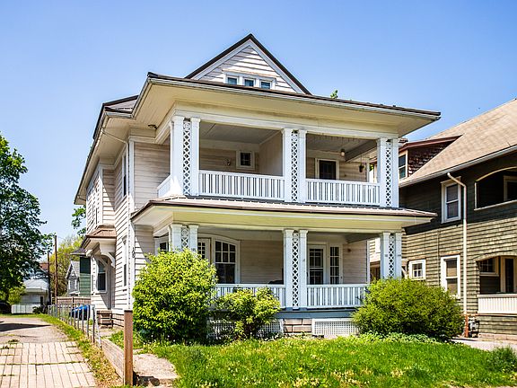 Rare find! Huge, 4-bedroom half house with off-street parking and laundry onsite in quiet Upper Monroe neighborhood. Freshly painted with 1,700 sq ft of comfortable living space, including three levels, four bedrooms, two bathrooms. Porch on the lower level and balcony on the upper level provide beautiful outdoor space. Spacious kitchen with stainless steel appliances, dining room, and large living room with decorative fireplace. Gorgeous 20th century detail throughout the house, including original hardwood, trim, and details. Walkable distance to bars and restaurants. Easy access to and from local colleges include University of Rochester, St. John Fischer, Naz, and MCC. Pets allowed. Make this charming house your home! Tenant pays electricity, heat, and internet. Landlord pays garbage and water. Message on Zillow for showing inquiries. One year lease, first month rent and security deposit due at signing. Available now. One year lease, first month rent and security deposit due at signing. Available now. Off-street parking. Private laundry in basement. No smoking. Pets allowed, one-time pet fee due at signing.
