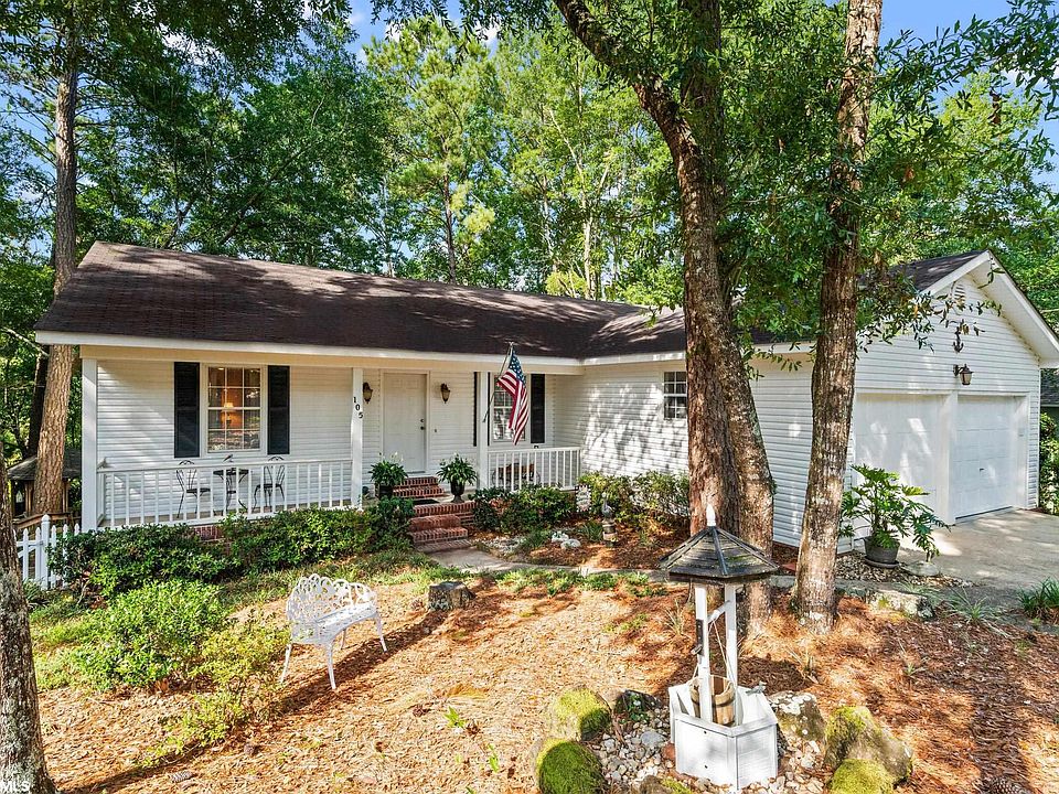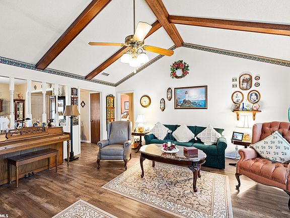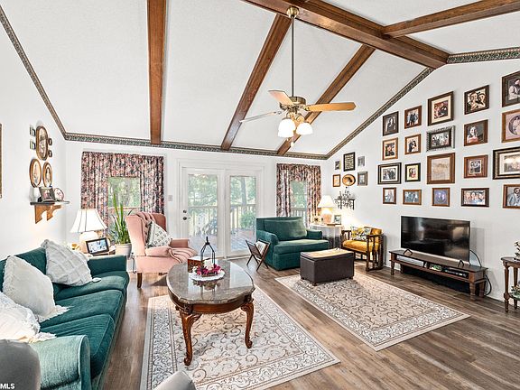 Take a look at this 3 bed, 2 bath LAKE FRONT home in Lake Forest Subdivision. Walk in through the foyer and the large formal dining is on your right with the living room straight ahead. Living room has vaulted ceilings and new french doors leading out to the deck. Beautiful lake views from the deck, primary bedroom and the eat-in dining room in the kitchen. New vinyl flooring in all the main living areas and primary bedroom. Brand new HVAC and new stove in the kitchen installed March 2023. Water heater replaced in 2019. Refrigerator stays with the home. Primary bedroom has large windows with the beautiful lake views, a walk in closet and in-suite bath. The home has a two car garage and great landscaping complete with a gazebo and dock. Great storage for lawn equipment under the house. Seller's Will provide a home warranty. Wonderful neighborhood and convenient location to everything including I-10 for easy commute.