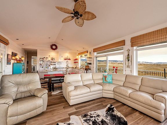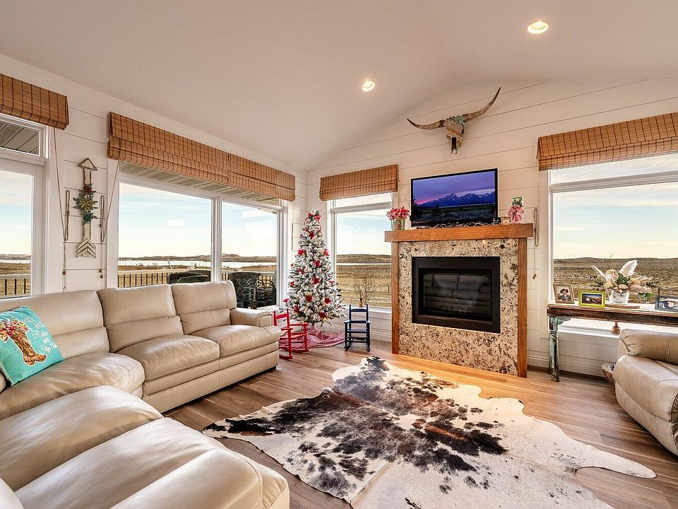 Beautiful custom built lake home w/ panoramic views over looking Lake DeSmet & the Bighorn Mountains. Open floor plan w/large Pella windows to enjoy your view. Kitchen has granite counter tops with a center island w/ added storage. Master bedroom has a sliding door out to the deck plus a covered patio. Walk out daylight finished basement w/ large family room, 3/4 bath. laundry room & 3rd bedroom. Large barn, w/ pipe corrals, & 2nd duplex modular home. Nice yard with sprinkler system. New exterior paint w/in the past year. 2 wells. 1 Solar well w/ pipeline and tire tanks into 3 separate pastures. 4thpasture has water hydrant access. Large pipe corrals w/ automatic waters & open face sheds plus a 3 stall barn with runs and a small trap, tack room and hay storage. Large outdoor pipe arena. Single wide modular duplex with 2 bedrooms and 1 bath per unit plus a shared laundry room. Duplex is currently rented. 2 septic systems. One system is for the single wide modular home and the 2nd is for the main house. The view of the lake and mountains are absolutely fabulous. NO covenants so the ability for commercial development is good. Whole house generator. This home is owned by a licensed Real Estate Associate Broker in Wyoming. All measurements are approximate.