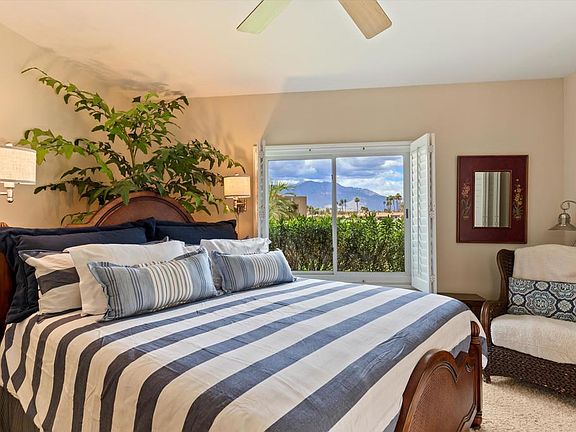 You don't have to give up LIFE ON THE WATER by moving to this desert home! Lake Mirage provides a truly unique experience as an 80-acre community with 2 lakes totaling more than 20 acres and 238 lakefront homes with their own DOCKS, that you can DUFFY BOAT, paddle board or canoe on and enjoy! This Plan A is a RARE corner unit with +2 kitchen windows and HIGH 12' ceilings for lots of natural light and less shared walls. Plus jaw-dropping VIEWS of water & mountains. It features DUAL PRIMARY suites PLUS a built in OFFICE SPACE. Each bedroom has an en-suite bathroom and walk-in closet, private, front courtyard entry, enclosed atrium courtyard off of the kitchen and dining areas, a fireplace, powder room, inside laundry, and rear west-facing covered patio with awning. Original owners since 1989 have taken great care by outfitting this home 'stem to stern' with upgraded Sierra Pacific doors and windows, custom built-in cabinetry, including converting wet bar area to built-in desk, upgraded kitchen & baths, and garage built-ins. HOA includes 24-hour guarded gate entrance, gorgeous grounds, 11 community pools and spas (one just steps from the unit), 10 tennis and 2 pickleball courts, racquetball/squash court, fitness area, a 3 hole pitch & putt golf course, catch & release fishing, plus 2 Yacht Club boats available for resident use. Lake Mirage's optional Yacht Club offers social activities and also enjoys reciprocity with the Southern California Yacht Club Association. The neighborhood is convenient to Palm Springs, El Paseo shopping, dining, entertainment & art, Agua Caliente Casino, Acrisure Arena offering hockey & concerts, as well as Eisenhower Medical Center. A MUST 'SEA'!