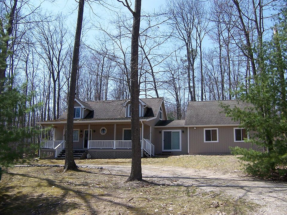 HILLTOP ESTATES, HIGGINS LAKE: Beautiful home in popular west side location, on wooded half acre corner lot. 2BR plus open loft (3rd BR) and Office/Den on main level. Heated and cooled by natural gas. Home has been updated in recent years to include new flooring in all main rooms, newer furnace, knotty pine ceiling on covered front porch, finished and heated garage used as a party room. Garage is equipped with a mini fridge, bar area, can lights, and Lifestyle Screen to provide a bug-free environment. Bedrooms feature large closets. Brick fireplace equipped with gas logs. Major appliances incl in sale. WiFi thermostat and Invisible Fence installed. Quality, clean furniture and furnishings are available and negotiable. This home has been lovingly maintained and lightly used as a 2nd home.