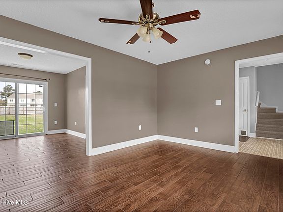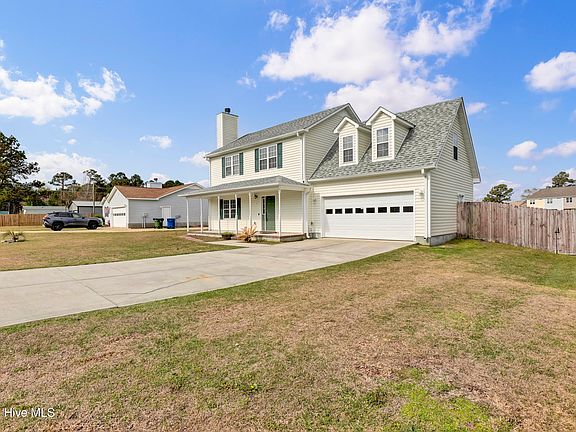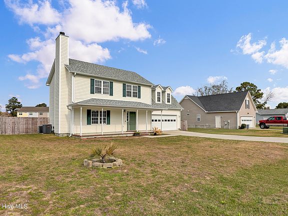 Conveniently located near the back gate of Camp Lejeune and just minutes from North Topsail Beach, this home offers the perfect blend of work and leisure. Located in the desirable neighborhood of Justice Farms, with NO HOA, this 3-bedroom home, plus large bonus room over the garage, is ready for its new owners. Inside, you will walk into the warm and cozy living room which features a fireplace with built-in cabinets on each side. The living room connects to the dining area making the layout feel open and airy. The sliding glass doors in the dining room will lead you outdoors to access the concrete patio, which is perfect for entertaining or grilling. The spacious yard also has a wooden privacy fence, making the outdoor area a wonderful place to relax. The kitchen comes fully equipped with plenty of cabinet space and all of the kitchen appliances will convey with the sale of the home. Upstairs, the primary bedroom has a large walk-in closet and an en suite bathroom where you can enjoy the jacuzzi style bathtub fully equipped with jets. In addition to the 2 additional bedrooms, there is a large bonus area over the garage that would make for a great home office or game room. The clothes washer and dryer will also convey with the sale of the home making this the perfect option for someone who is ready to move in today!