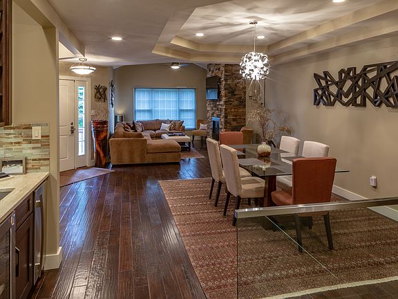 Upscale customization to this condo that you will love to live! Spacious floor plan to include living room with vaulted ceiling and stacked stone fireplace, custom cabinets with gas range, stainless steel hood and Jenn-Air appliances, to include wet bar into the open dining room with tray ceiling. Spacious bedrooms to retreat along with amazing bathrooms, numerous walk-in closets and centrally located large laundry room. Remote controlled blinds and custom draperies. All lights have dimming options, surround sound, large deck, glass handrail with LED leading to basement finished with work out room, bathroom and built in storage, could add additional basement. Tankless hot water heater. Garage and all closets have built in storage to enjoy in this upscale condo for the buyer that enjoys luxury and easy lifestyle.