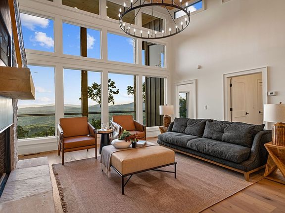 New Construction, mountain modern featuring some of the most spectacular views in all of North Georgia. Designed for both luxury and entertaining, this 4-bedroom, 4-bath residence features en suite bathrooms for every bedroom and dramatic architecture that maximizes its setting. Step inside to a wall of windows and floor-to-ceiling glass that frame endless layered mountain vistas. Modern glass railings with a built-in bar top keep sight-lines unobstructed and create the perfect space for gathering with family and friends. The open kitchen is a showpiece with custom cabinetry, upscale appliances, a gas range, and a spacious dining area. The main-level primary suite offers a stunning retreat with an accent wall, oversized windows, dual vanities, a custom tile shower, soaking tub, separate water closet, and a walk in closet w/ laundry hookups. A second main-level suite includes a large ADA bathroom with double vanities, custom tile shower, and direct access to the porch. Outdoor living is unmatched with two exterior fireplaces, multiple covered porches, and a spiral staircase leading down to a third-level terrace designed for games and gatherings. The finished terrace level adds another great room with fireplace, a sleek modern wet bar with wine cooler, a second laundry area, and two additional en suite bedrooms. Beautiful stonework, abundant storage, and thoughtful design throughout make this new construction an exceptional mountain getaway, or high-end rental opportunity.