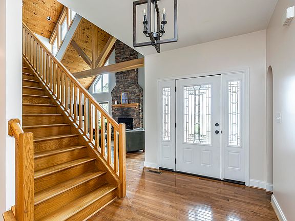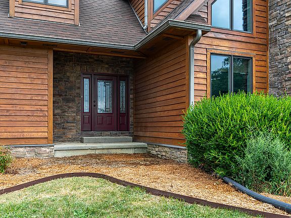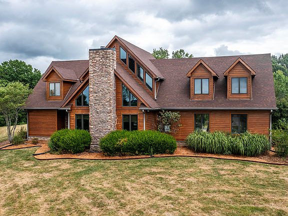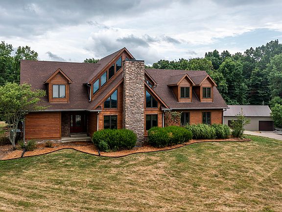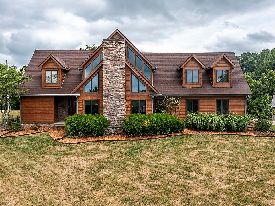 Tranquility at its finest! Unique, custom home sitting high on a hill, near Lovers Leap Winery, with glorious views looking out towards Shelby & Franklin counties all located within Lawrenceburg with the KY River located nearby, behind the property! Wildlife & trees everywhere you turn on the 3.8 acres! 4 beds, 2.5 baths, 5-car garage capabilities with large open great room featuring a stone fireplace & 30' tall ceiling. Primary Suite on main floor. SPACIOUS upstairs bedrooms, large enough for entertainment & sitting areas. Kitchen is open to dining area w/ designated home office area nearby. Large pantry right off the kitchen, as well as a designated mudroom & separate laundry room when you enter from the garage. There's even room to add cubbies to corral the chaos when you enter the home! Large screened in porch w/ access from dining area & Primary Bedroom. Above ground swimming pool with sundeck around it. Detached garage with electrical service to tinker and possibly rebuild an antique vehicle or do woodworking. It has 2 garage doors but space for 3 cards inside. So much nature to enjoy! Call today to schedule your private tour!