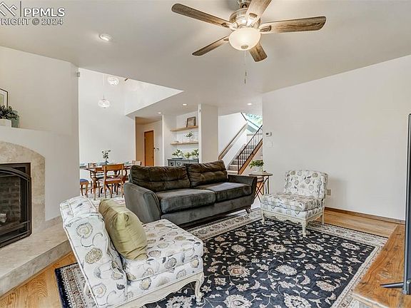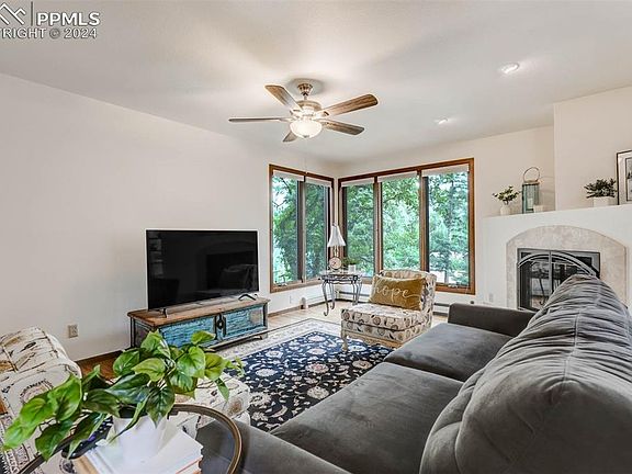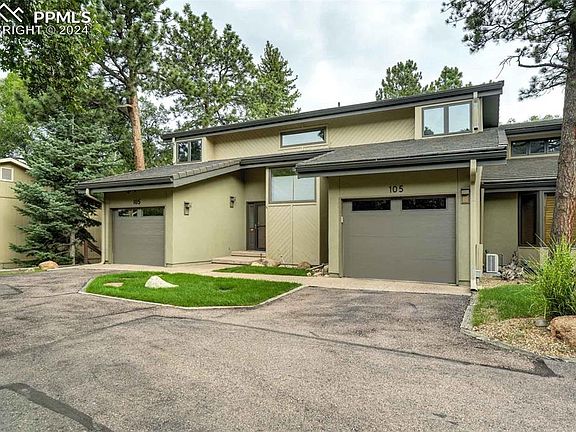 This luxury townhome nestled among the tree canopy offers comfort, convenience & modern luxury upgrades throughout. Located in the desirable Mayhurst neighborhood situated between Cheyenne Canyon & the iconic Broadmoor Hotel. Walking distance to Stratton open space w/trails, easy access to schools, shopping, entertainment, & main roads. The entry opens to refinished solid oak hardwood floors that lead you in to the bright & open great & flow throughout the entire main level. The great room features an upgraded gas fireplace w/ limestone surround and views of the landscape. The adjoining dining space is flexible for large tables & opens to the glass atrium surrounded by a wall of windows enveloping you in the outdoors. This allows the natural light to pour into the main level. From here you can walk-out to the private elevated deck w/gas line, perfect for BBQ’s & enjoying the CO outdrs. The gourmet kitchen boasts gorgeous granite island w/breakfast bar, knotty pine solid wood cabinets w/upgraded brushed nickel hardware, pantry, wood floors, stylish tile backsplash, custom panelized appliances, & built-in workstation. Completing the main level is a powder bath & the laundry room w/sink & shelving.Head upstairs to the loft w/newer plush carpet, & 2 primary suites. Both suites have bay windows, walk-in closets, mountain views, sitting areas, as well as remodeled spa-like bathrooms. One bathroom has a soaking tub & heated flrs while the other is newly updated w/luxury shower, designer tile floor & quartz counters. This upper level is a private retreat offering solitude amongst the pines! Downstairs the lower-level walk-out family room has gas fireplace & open layout. The lower-lvl bedroom has easy access to full bath w/jetted tub. Covered lower concrete patio overlooks the fenced backyard. Additional highlights incl electric vehicle charger, ductless A/C system upstairs, tile roof, updated windows, & many more. This home is surrounded by all the modern conveniences.