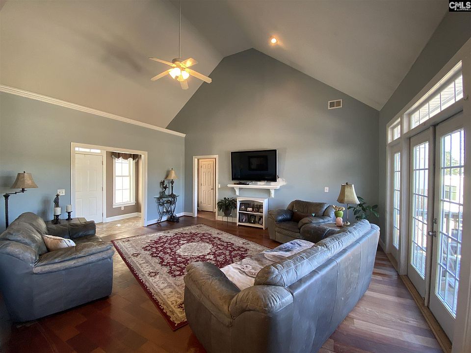 - RoomLivingRoomFeatures: French Doors, Floors-Hardwood, Ceilings-Cathedral, Ceilings-High (over 9 Ft), Ceiling Fan, Recessed Lights
