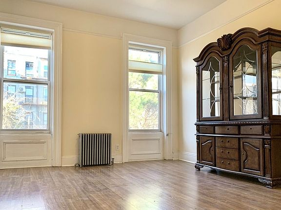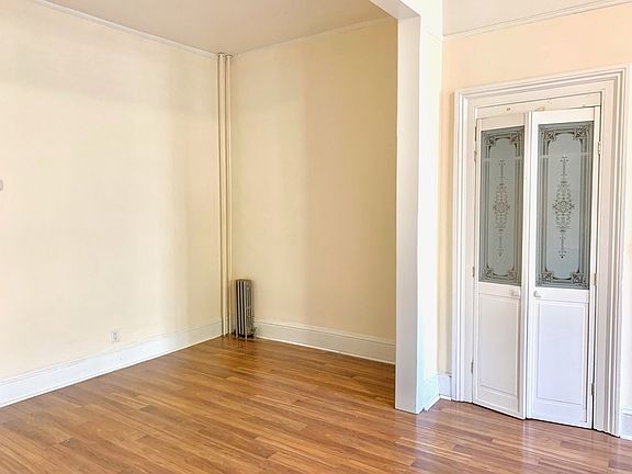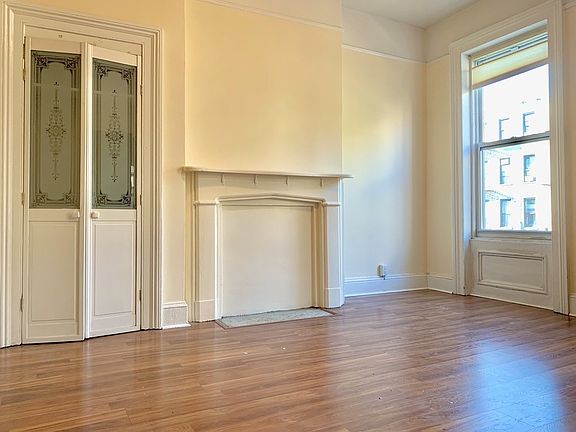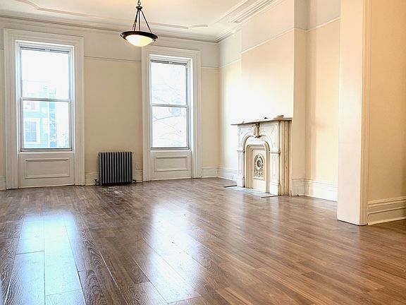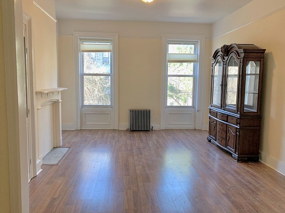 Available for immediate occupancy, this rare gem in the heart of Greenpoint's Historic District occupies the entire 2nd floor of a landmarked 19th century brick row house on tree-lined Milton Street, with over 1,200 square feet of living space and a versatile floor-through layout allowing its use as an oversized one or comfortable two bedroom conversion. There is a spacious living room, formal dining area, and separate modern kitchen with stainless steel appliances, plus 1.5 custom tiled baths and ample storage space with a total of 4 closets throughout. Refinished floors, double-height ceilings and large windows lend an airy, loft-like vibe, punctuated with elevated lighting and lovingly restored original details including two decorative fireplaces, crown molding and etched glass paneling. All perfectly located, just off bustling Manhattan Avenue with its many amenities and conveniences and just two blocks from the Greenpoint Avenue G train and all major area buses. Last but not least is proximity to the expanse of green and recreational space along the waterfront, with Transmitter Park, East River Park, and Bushwick Inlet Park all just a short distance away. Small pets allowed case-by-case, heat and hot water included, no broker's fee!