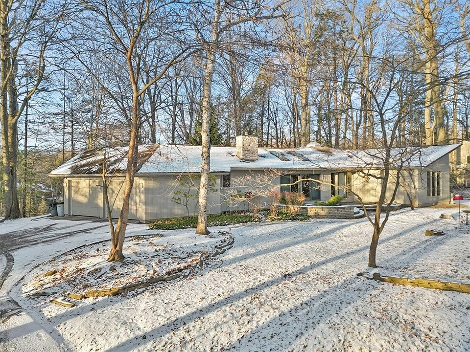 This incredible true contemporary with soaring ceilings, walls of glass and signature architectural details on Mountain Road in Penfield cannot be replaced. Sitting on over 1 acre and offering close to 3000 sq ft with 4 bedrooms and 2.5 baths is waiting for your individual touches. Beautiful woodwork, sprawling rooms, formal dining room opens to the truly outstanding great circular great room with cathedral ceilings and gas fireplace to give the added warmth. Kitchen offers ample counter space and cabinetry, huge built-in dinette, and sitting area to gather in front of your wood-burning stove. Access to your multiple decks and patio areas front and rear. First floor primary bedroom suite is huge with incredible walk-in closet. Lower Level offers 3 bedrooms or two with an office, another full bath and again access to patio areas and decking. Extensive landscaping, front patio and walkways newer, on-demand hot water, beautiful 1+ acre lot