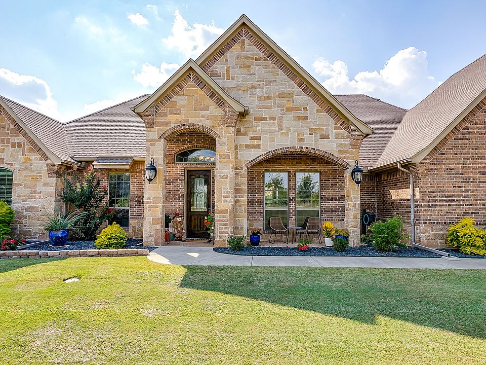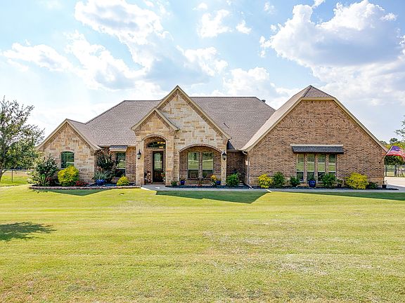 Set on a full acre, this exceptional custom-built home is the true epitome of Texas style, charm, and craftsmanship. Designed and constructed by the builder as his personal residence, detail reflects quality construction, thoughtful design, and unmistakable pride of ownership. This stunning 4 bdrm (one that can also be an office), 2.5 bath home offers soaring 10-foot ceilings accented by elegant crown molding throughout, adding a refined, timeless finish. The well-designed layout, carefully selected finishes & architectural details showcase classic Texas character at every turn. The kitchen & living spaces are elevated by rich, custom-built wood cabinets-crafted with care & carried throughout the home for beauty, function & timeless style! Elegant crown molding accents the main living areas & primary bdrm, while wide baseboard molding runs throughout the home, adding refinement to every room. This home has a fabulous chef's kitchen for family gatherings & family cooking, boasting a double oven, a 5-burner gas stove, a center island with storage, a large walk-in pantry & a 2nd dining area. Enjoy the privacy provided by the backyard's tree wall & the soothing view of the neighboring pond from the expansive back porch. The extra large covered back patio (33x14) also creates the perfect setting for entertaining or simply savoring quiet evenings outdoors. Numerous upgrades throughout, highlight the home's immaculate care and thoughtful design. It includes a rare 3.5 car garage, offering abundant space for vehicles, an EV outlet, storage with lots of cabinets...could be a great workshop. The garage includes a bonus room with countertops and cabinets. From the beautifully landscaped acre lot to the warm, inviting interior finishes, this gorgeous home resonates with everything Texas living is all about. This property blends elegance, functionality and authentic Texas spirit into a home as unique as it is beautiful!!