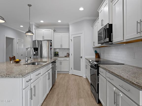 In addition to the large rooms, this turn-key ready home on a small cul-de-sac was just entirely painted & boasts hardwood/ LVP flooring throughout the ENTIRE home. With its many upscale features designed for fabulous entertaining & low-maintenance living. This like-new home features luxury wide-plank vinyl floors, crown & wainscot moldings, tray ceilings, recessed lighting, screened porch, an expanded patio, and an easy-to-maintain yard. Also on the main floor are two additional bedrooms, one with French doors that could also be used as a home office, a full bath, laundry room with built-in cabinetry, and a mudroom with a bench & cubbies. Upstairs living would be perfect for a mother-in-law suite that features a large bonus room, the 4th BR (or quiet office space) with a full bath, a large storage closet, and a walk-in attic for additional storage. This is a work-from-home dream with its separate location and high-speed internet. Wyndwater is the perfect lifestyle community with a pool, picnic areas, walking trails, small-boat launches off of the natural wood gazebos, and a free ICW boat landing just minutes away. Home is also in the highly desirable Topsail School District, 15 minutes from Surf City, shopping, and more!
