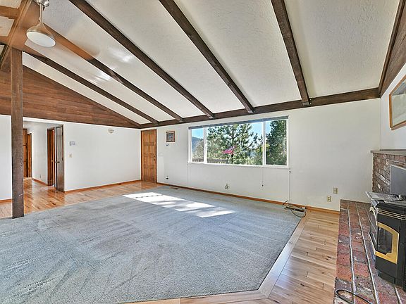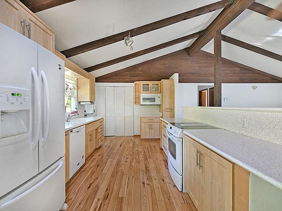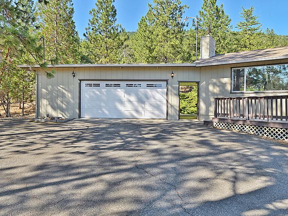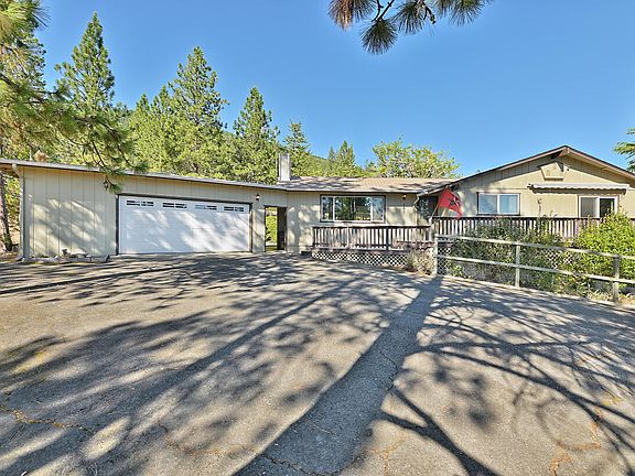 Home sits up on a knoll with nearly 2 usable acres. Stunning views of the surrounding mountains gives a peaceful feel of privacy. You will love the vaulted ceilings through-out the home, fireplace with pellet insert, gives this home a cozy feel. Kitchen had been remodeled, with white corian counter tops, white appliances, beautiful wood cabinets, and wood floors. Three bedrooms with master having walk in closet, vaulted ceiling and full bath. Detached is a two car garage with a covered breezeway for evening BBQ's. A deck surrounds the front of the home, along with may oak trees, and a paved driveway complete this package.